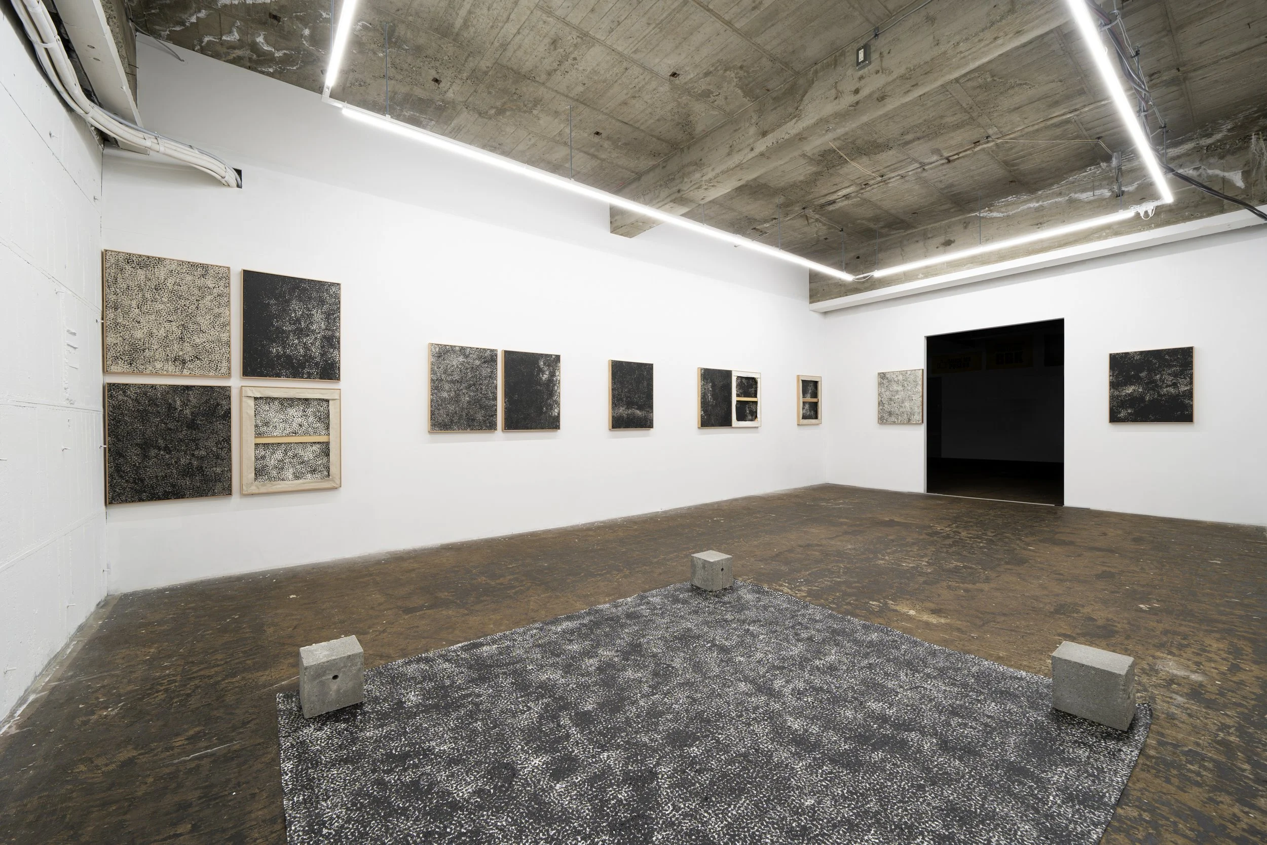 緒方数馬は1986年福岡生まれで、現在は東京を生活拠点に制作活動を行っています。緒方の今シリーズの作品は、塗料が付着したスニーカーでキャンバス上を歩き、踏まれた痕跡が重なり完成へと向かっていきます。地に足をつけ歩くという行為は買い物をすること、人に会うことなど、行動を目的とするときに必要不可欠かつ原始的身体動作であるがゆえに日常的であるといえます。そのような慣習的ミニマルさによる集積が画面一杯に広がったオールオーヴァーな平面的抽象性と、スニーカーの足裏がそのまま具体的に痕跡として残る具象性が独自の静けさを伴った奥行きのある画面として存在しています。体重によって踏み潰され付着した塗料の無作為なマチエールも、数あるスニーカーから制作のために選出された物の副産物であり、キャンバスに足をつけたまま左右上下に擦り付け画面を埋めるという行為を排除し、スニーカーの凹凸だけをスタンプのように踏み下ろす根本的な描画素材の選択から生まれたオリジナリティを生のままいかした表情をそれぞれの作品にみることができます。